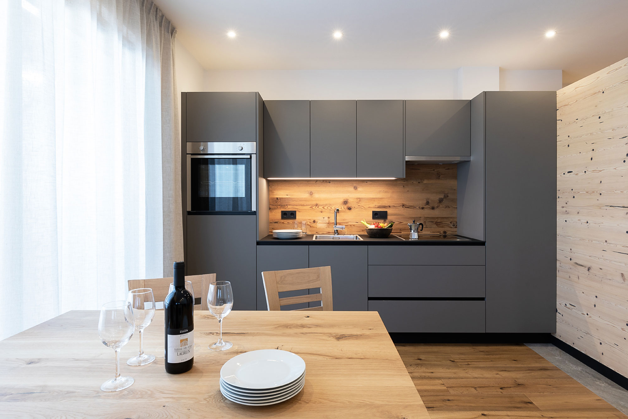Il balcone invita a soffermarsi – con una vista splendida e ampia sul verde. Molto legno massiccio, incluso il pino cembro locale, e pavimenti in legno caldo creano un’atmosfera accogliente. Nei giorni freddi, il riscaldamento a pavimento garantisce un comfort piacevole – ideale per giornate attive in vacanza e serate rilassanti con amici.