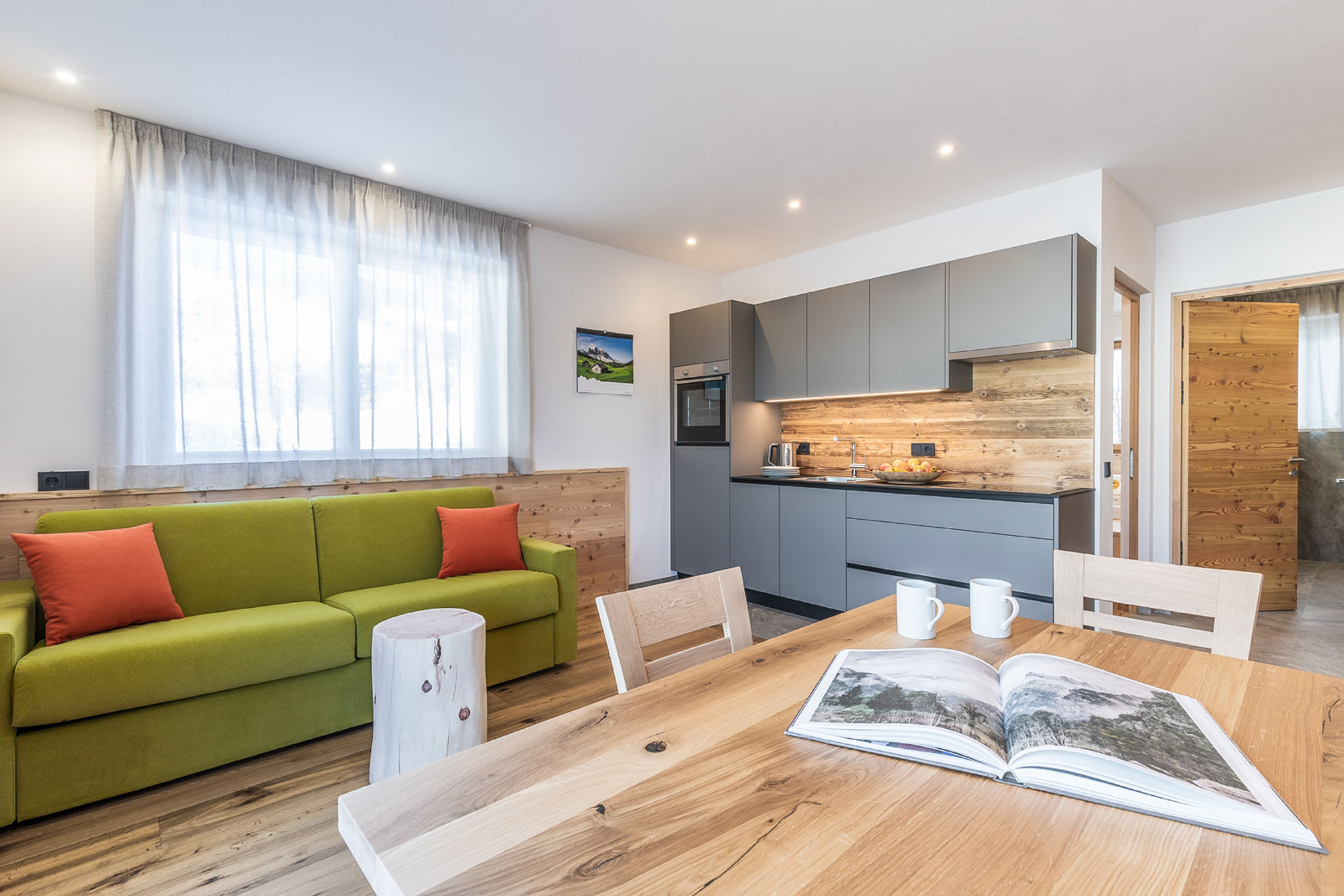 Platz für vier bis maximal sechs Personen bietet das großzügige Apartment IGNIS im Obergeschoss – mit eigenem Balkon und weitem Blick ins Grüne. Zwei Schlafzimmer (eines mit Doppelbett, eines mit zwei Einzelbetten), ein weitläufiger Wohnbereich mit Küchenzeile und ausziehbarer Doppel-Schlafcouch sowie ein modernes Bad mit Dusche, WC und Bidet machen diese Wohnung zur perfekten Wahl für befreundete Paare oder Gruppen.